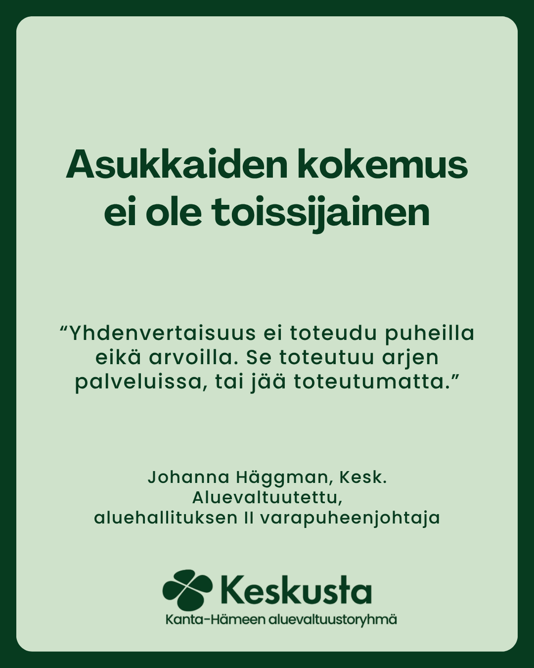 Kanta-Hämeen hyvinvointialueen arvoiksi on kirjattu yhdenvertaisuus, asiakaslähtöisyys, vaikuttavuus ja rohkeus. Nämä ovat painavia sanoja, mutta toteutuvatko ne käytännössä?