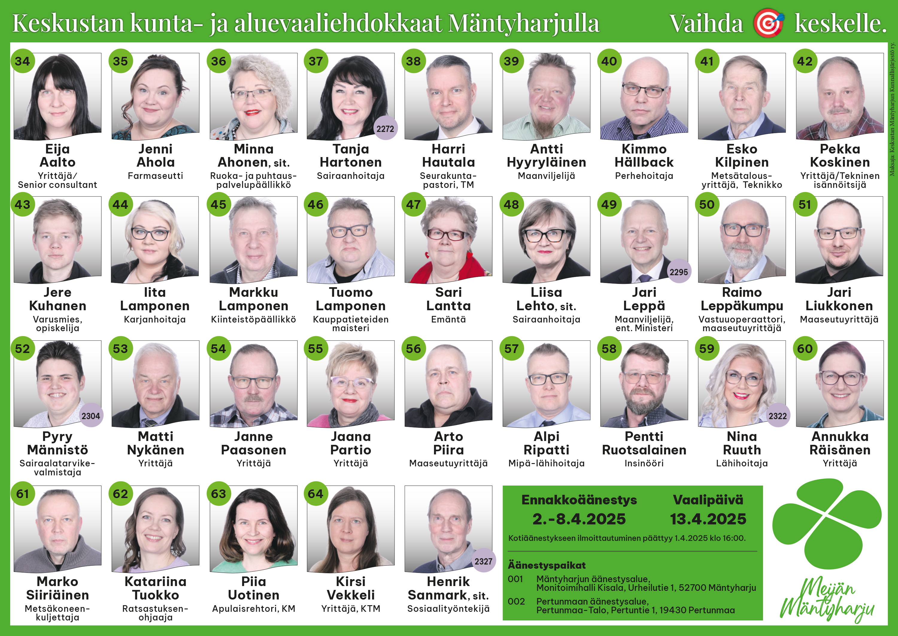 Tutustu Mäntyharjun Keskustan kuntavaaliehdokkaisiin alla olevan linkin kautta.