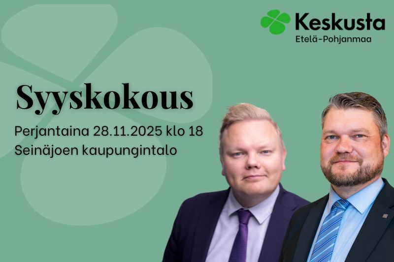 Keskustan Etelä-Pohjanmaan piirin syyskokous järjestetään perjantaina 28.11.2025 Seinäjoen kaupungintalolla (valtuustosali, Kirkkokatu 6) klo 18.00.