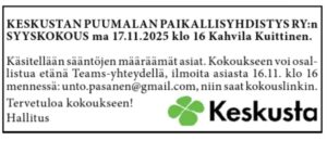 KESKUSTAN PUUMALAN PAIKALLISYHDISTYS RY:n Ylimääränen kokous 28.5.2025 klo 17 Kunnantalo
