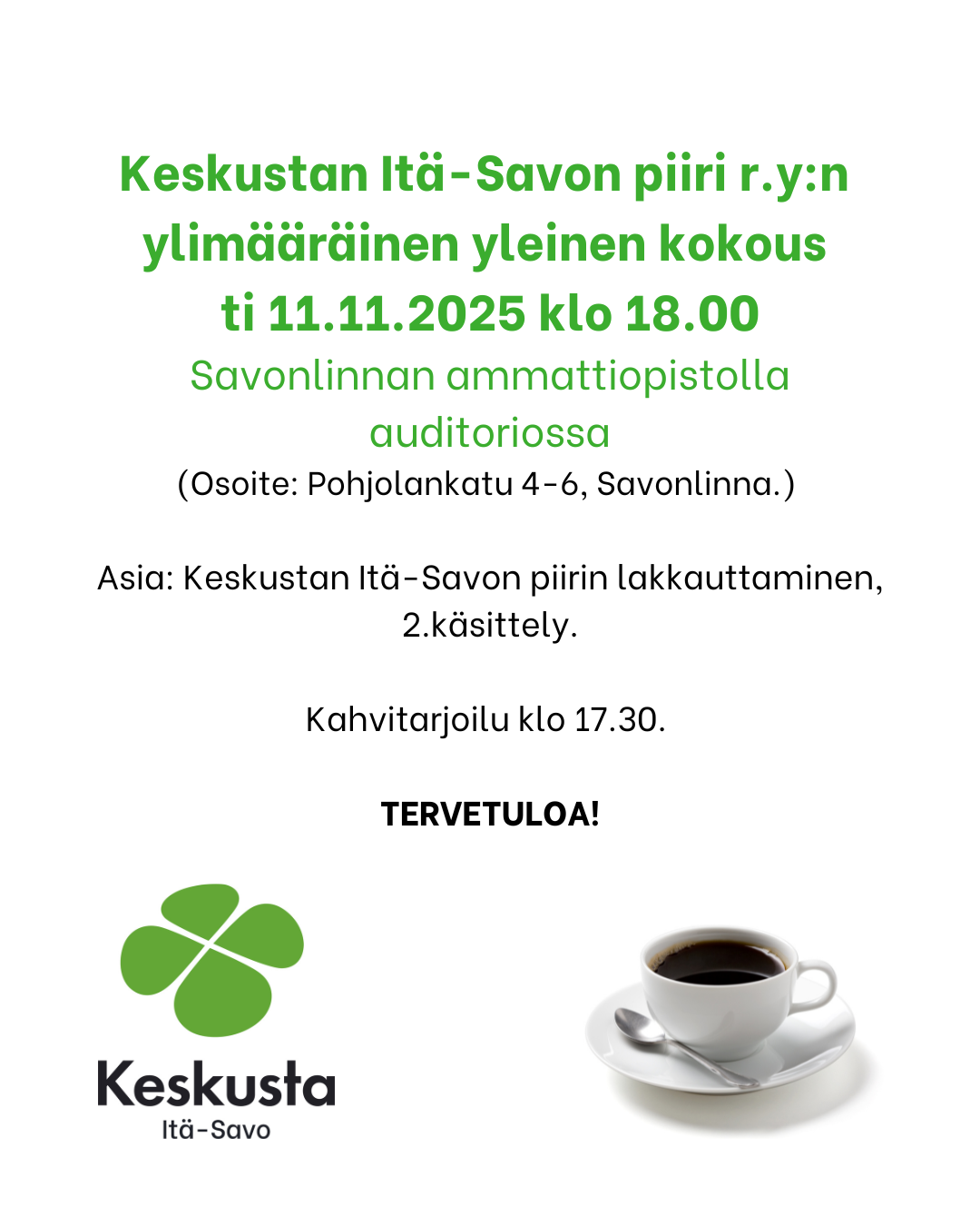 Keskustan Itä-Savon piiri r.y:n ylimääräinen yleinen kokous ti 11.11.2025 klo 18:00 Savonlinnan ammattiopistolla auditoriossa