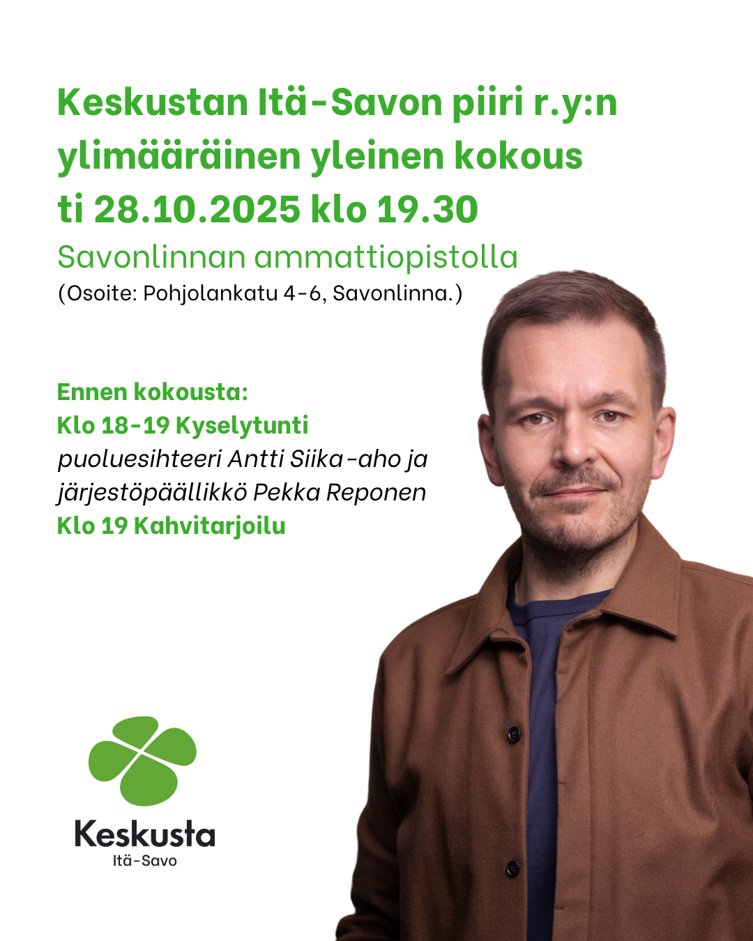 Keskustan Itä-Savon piiri r.y:n ylimääräinen yleinen kokous ti 28.10.2025 klo 19.30 Savonlinnan ammattiopistolla