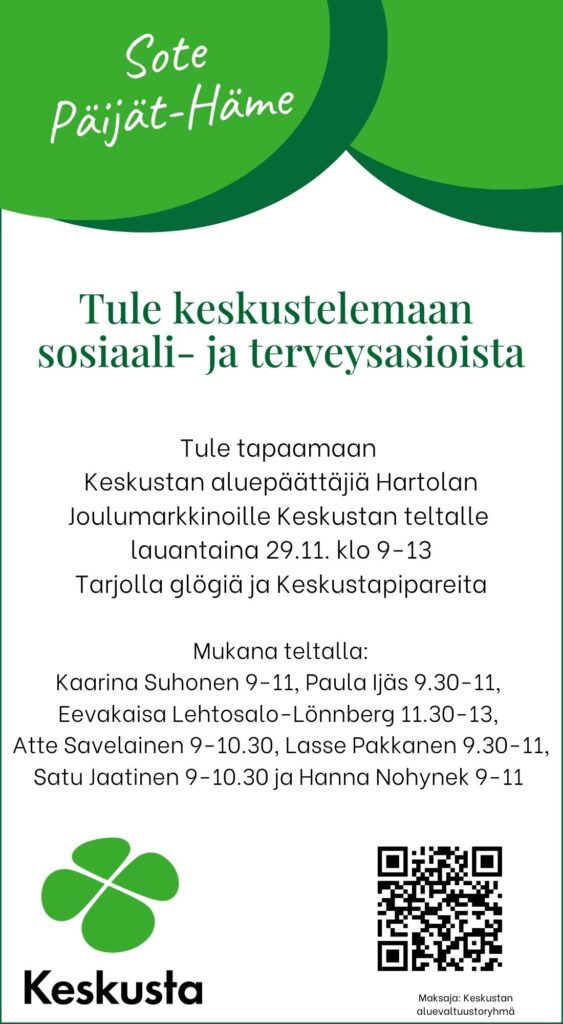 Tule tapaamaan Keskustan aluepäättäjiä Hartolan Joulumarkkinoille Keskustan teltalle lauantaina 29.11. klo 9-13