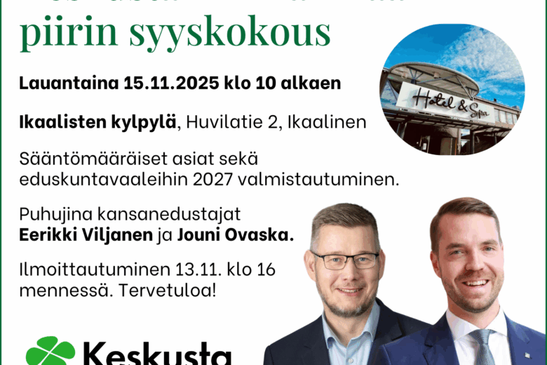 Tervetuloa Keskustan Pirkanmaan piirin syyskokoukseen lauantaina 15.11.2025 klo 10.00 alkaen