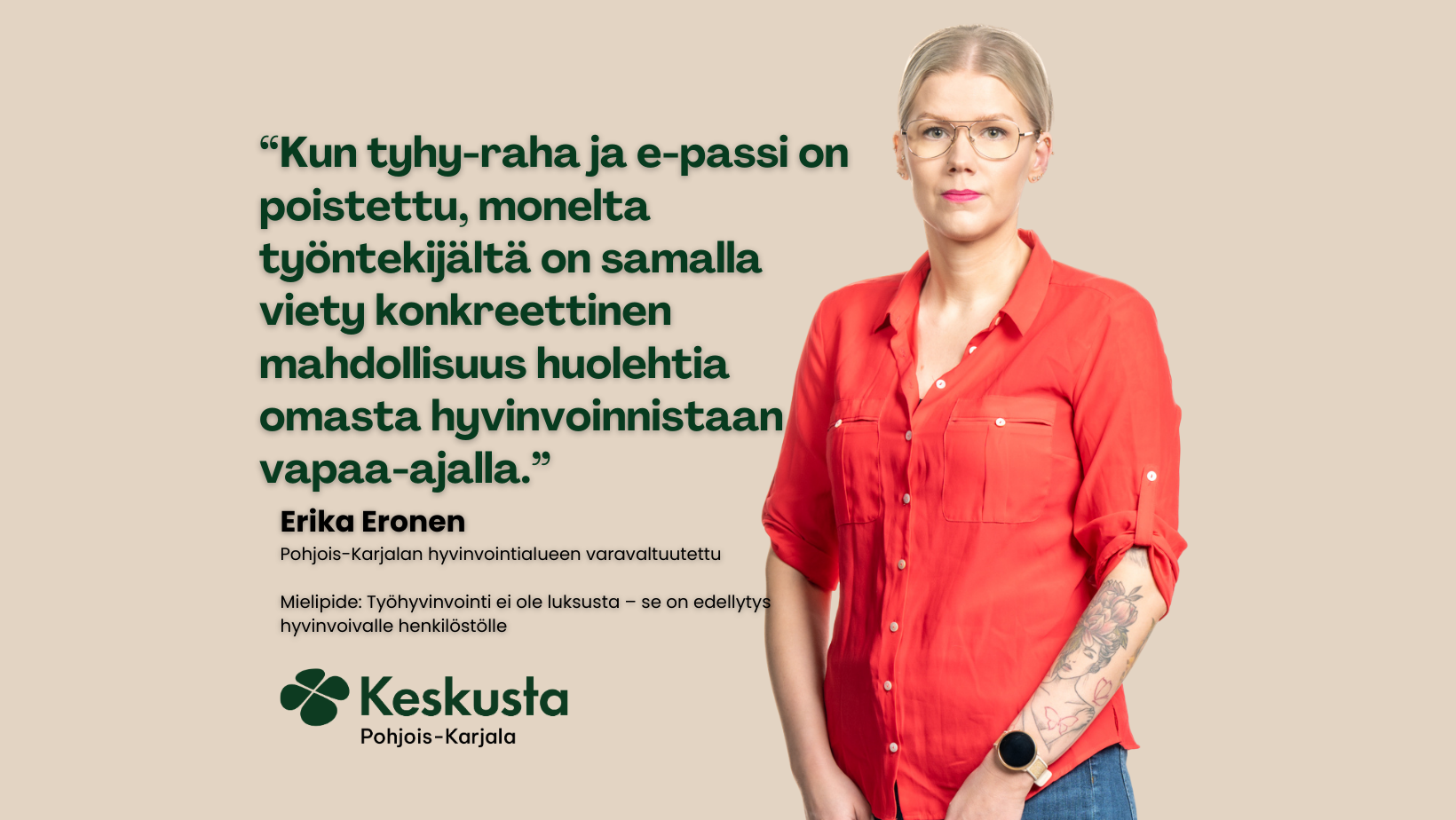 Pohjois-Karjalan hyvinvointialueella (Siun sote) on poistettu työhyvinvointia tukeneet tyhy-raha ja e-passin kaltaiset etuudet ainakin vuodelta 2026. Muutos osuu aikaan, jolloin sosiaali- ja terveysalan ja koko Siunsoten henkilöstö työskentelee jo valmiiksi kuormituksessa ja epävarmuudessa. Tässä tilanteessa työhyvinvointiin panostaminen ei saisi heikentyä – päinvastoin.