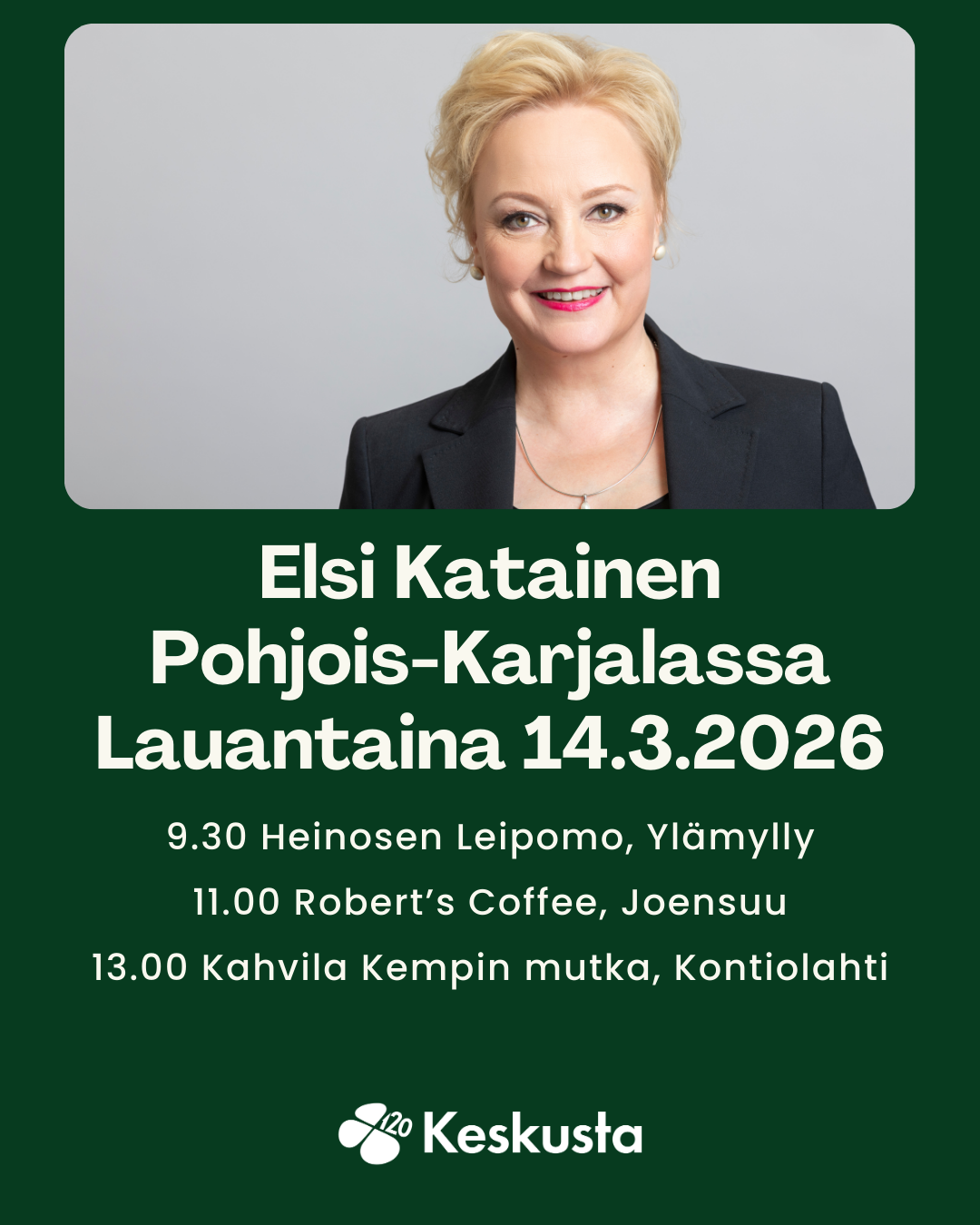 Keskustan Pohjois-Karjalan piiri ry. sääntömääräinen vuosikokous järjestetään lauantaina 11.4.2026 klo 10.00 Joensuussa Karelia AMK Tikkarinne (Tikkarinne 9, Joensuu)
