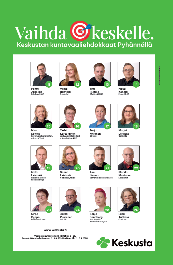 Pyhännän Keskustalla oli kuntavaaleissa 16 upeaa ehdokasta, jotka muodostivat vaalien jälkeen Pyhännän Keskustan valtuustoryhmän. Ryhmään kuuluu 12 varsinaista valtuutettua ja 4 varavaltuutettua.