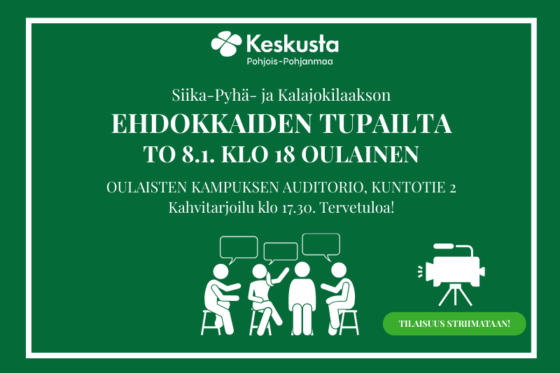 Järjestämme Siika-Pyhä- ja Kalajokilaakson alueen eduskuntavaalien ehdokkaaksi pyrkivien tupaillan Oulaisissa.