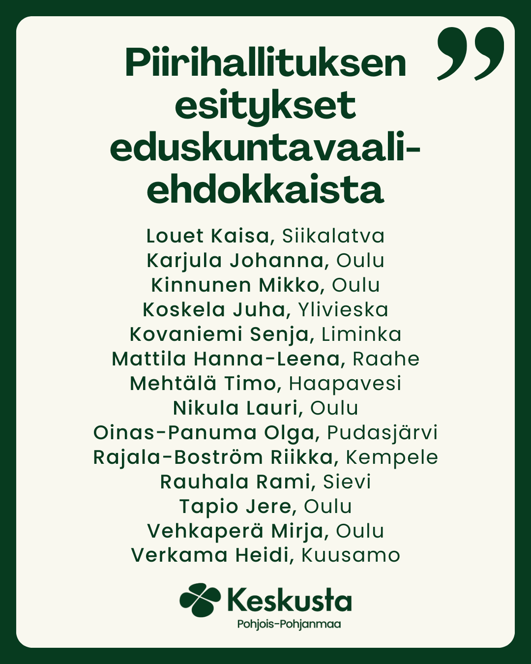 Piirihallituksen esitys 21.2. Oulussa pidettävälle ylimääräiselle piirikokoukselle eduskuntavaaliehdokkaista on: