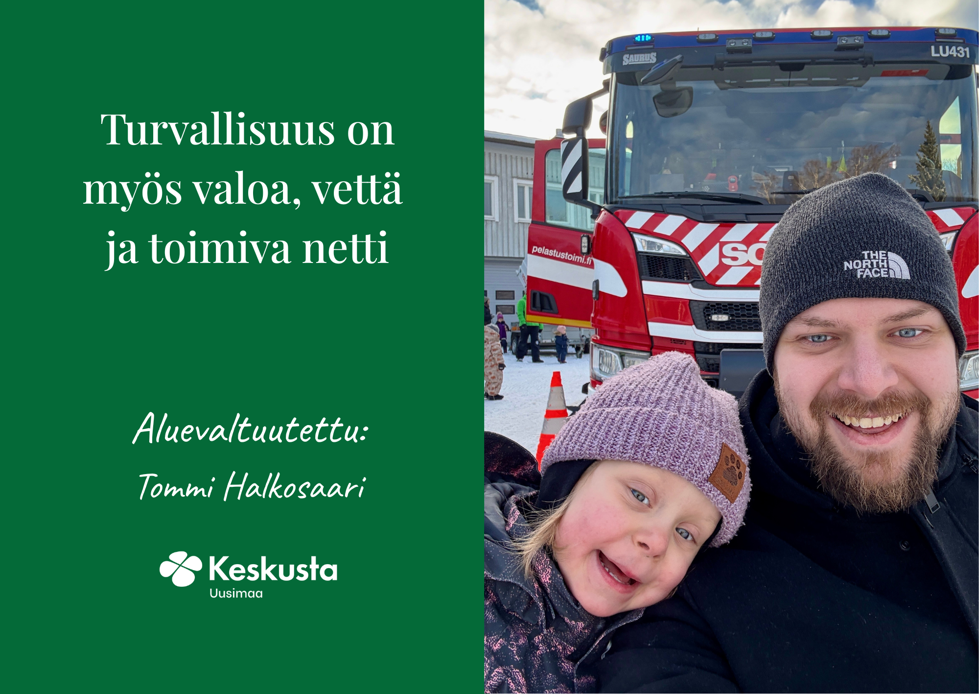Turvallisuus rakentuu jo pienistä teoista kotona, mutta myös isoista ratkaisuista yrityksissä ja julki silla toimijoilla. Meidän tehtävämme päättäjinä on varmistaa, että viranomaiset kestävät poikkeustilanteita, isoja tai pieniä. Jokaisen länsiuusimaalaisen tehtävä taas on huolehtia siitä, että arjessa pärjää – myös silloin, kun pistorasiasta ei tule sähköä.