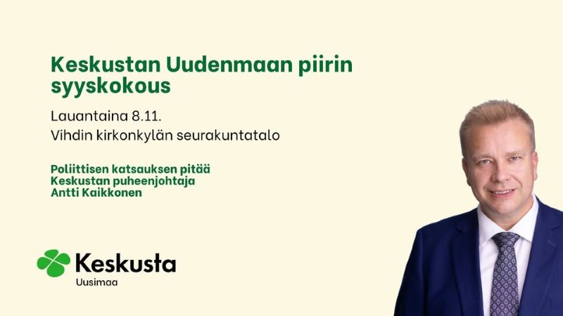 Keskustan Uudenmaan piirikokous kokoontuu Vihdissä lauantaina 8.11.2025. Kokouspäivä sisältää virallisen piirikokouksen agendan lisäksi tärkeän ja erittäin mielenkiintoisen hetken – piirin uuden puheenjohtajan valinnan.