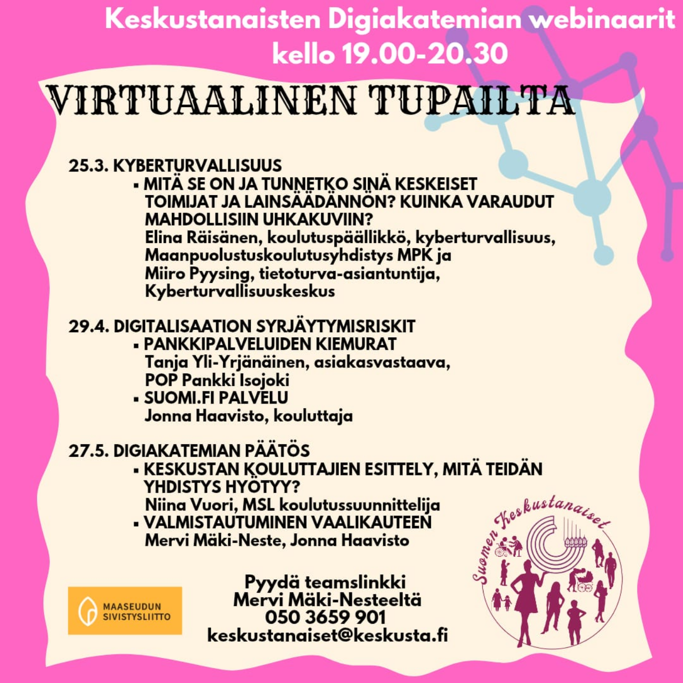 Keskustanaiset on valtakunnallinen, keskustalaiset arvot jakava naisjärjestö. Keskustanaisten toiminnan keskiössä on tasa-arvon ja naisten aseman edistäminen. Haluamme nostaa keskusteluun myös teemoja, joista puhutaan liian vähän, koska ne eivät kosketa valtaosaa meistä. Tai asioita, joista on joskus vaikea puhua. Joskus maailma on erilainen naisten silmin.
